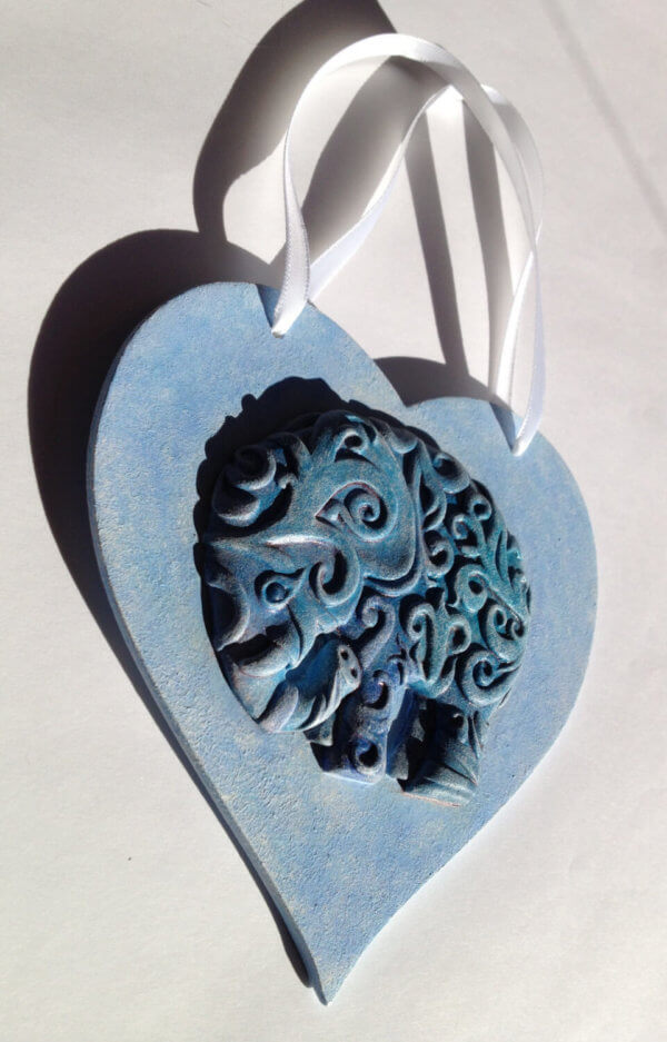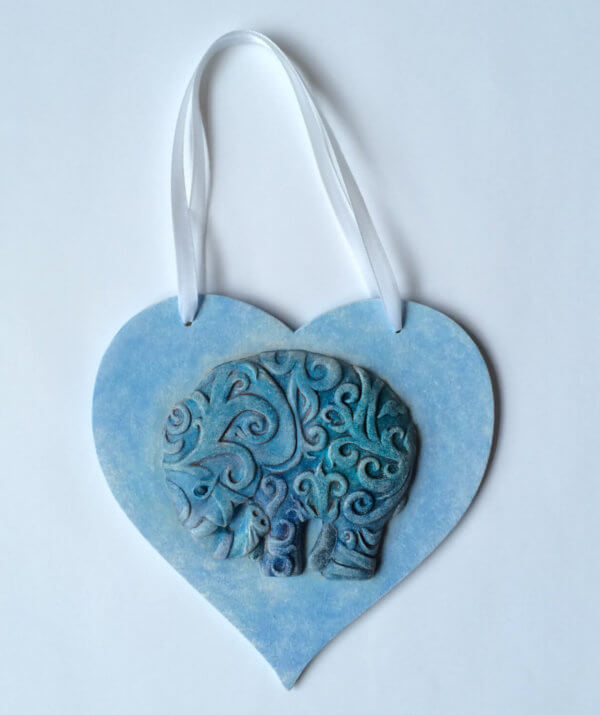 This piece was sculpted by myself in a polymer clay, moulded in silicon and then cast in polyurethane resin. It was primed, then hand painted with acrylic paints. The heart elephant was sculpted, cast and painted in Ashwell, North Hertfordshire, England.