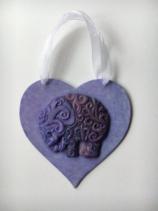 This piece was sculpted by myself in a polymer clay, moulded in silicon and then cast in polyurethane resin. It was primed, then hand painted with acrylic paints. The heart elephant was sculpted, cast and painted in Ashwell, North Hertfordshire, England.
